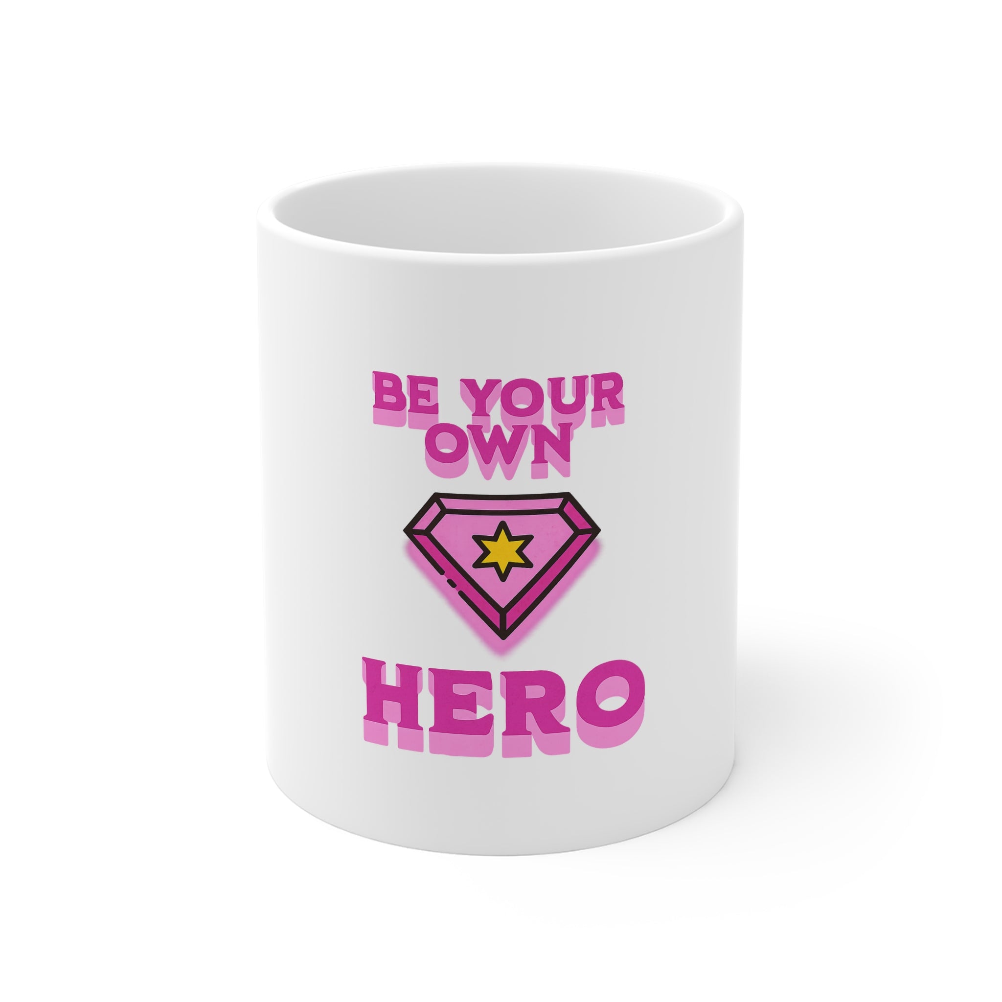 xBright mornings start here. This 11 oz white ceramic mug holds your first sip of courage and nudges you forward with a bold, playful message: “Be Your Own Hero.” The pink, retro-inspired emblem and chunky lettering catch the eye and lift the mood—small, steady reminders that your everyday moments matter. It feels at home on a crowded desk, beside a journal, or in a quiet kitchen while you plan the day. Durable ORCA coating keeps those vivid colors popping through many washes and reheats, so the graphic stays lively as you keep showing up for yourself.