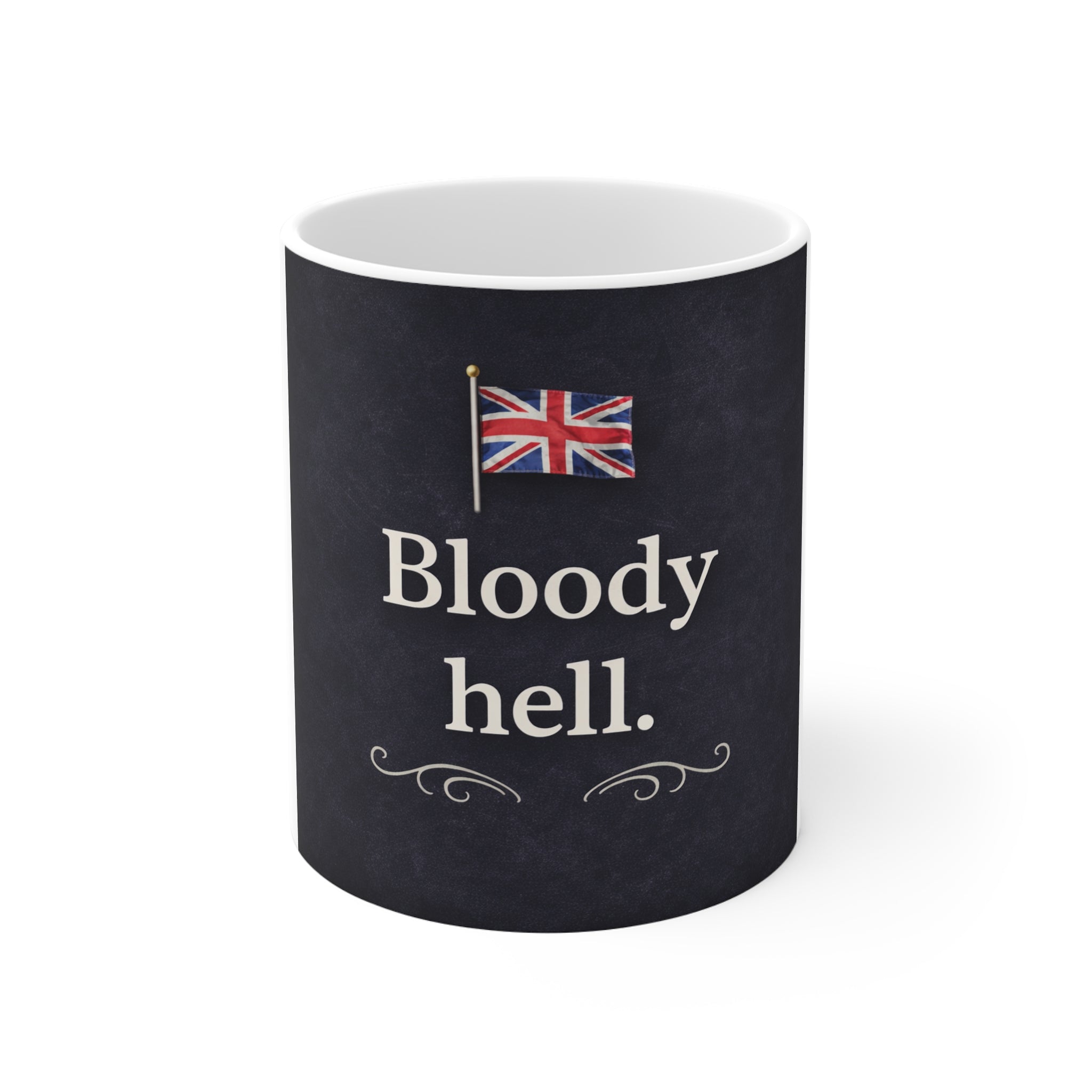 xStart mornings with a cup and a wink. This 11 oz white ceramic mug carries a cheeky, British-flavored message framed by a small Union Jack — quiet humor that reads like a knowing nudge to friends or housemates. The matte-dark background and simple ornamental accents give it a slightly vintage, lived-in look that fits on a cluttered kitchen counter or a tidy apartment shelf. It’s the kind of mug you reach for when you need a moment of levity between meetings, or when sharing a laugh over tea and gossip. Durable glazing keeps the print bright through regular use, so the design stays crisp while you sip and smile.