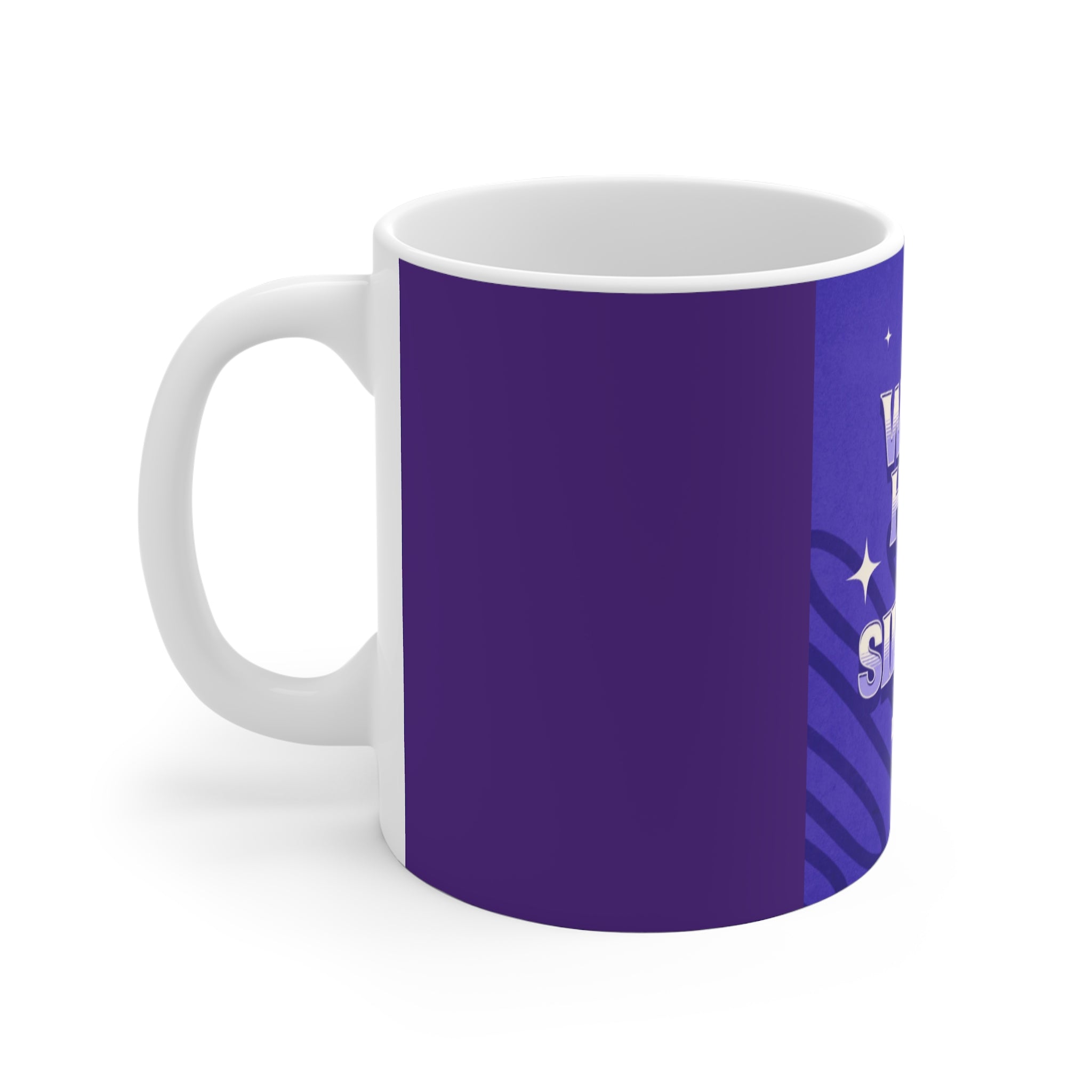 - 11 oz white ceramic mug with comfortable C-handle