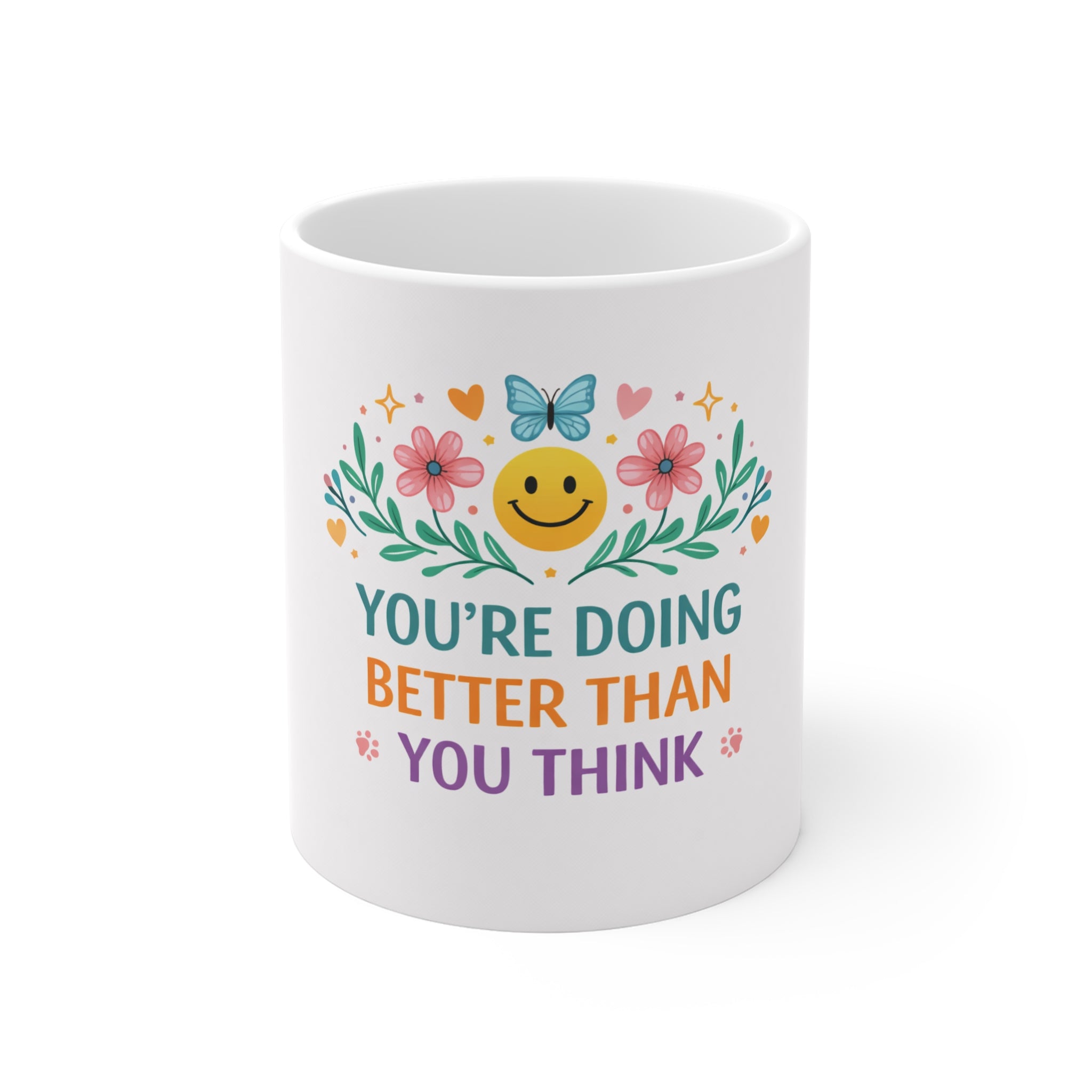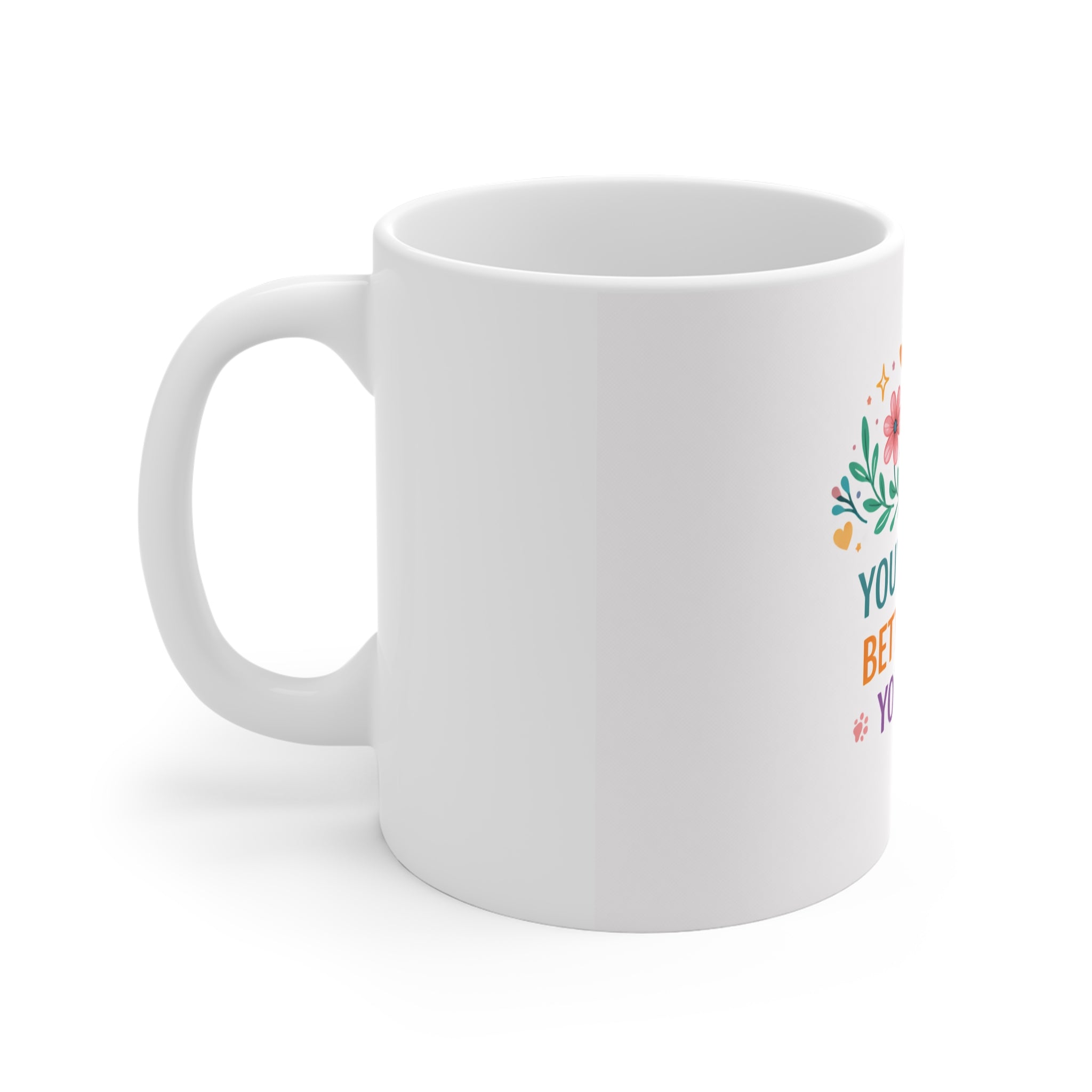 - 11 oz white ceramic body with comfortable C-handle