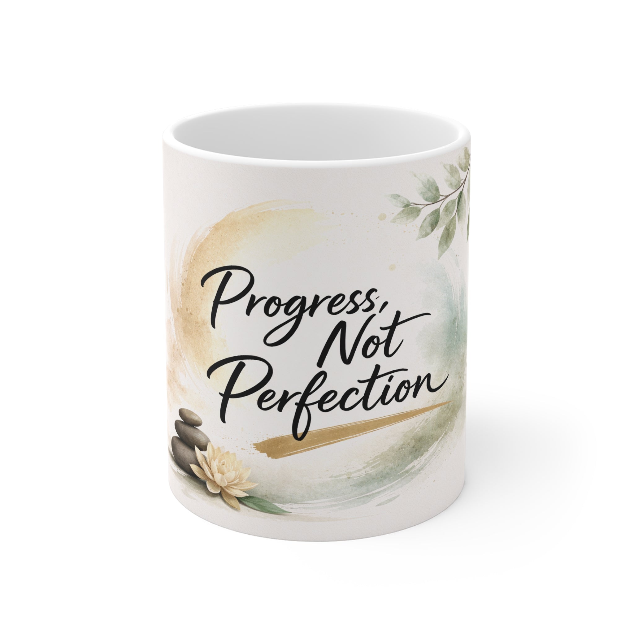 A gentle reminder to move forward without pressure. This 11oz ceramic mug features the quote “Progress, Not Perfection” in elegant calligraphy, paired with a soothing, minimalist design that encourages patience, balance, and self-compassion.