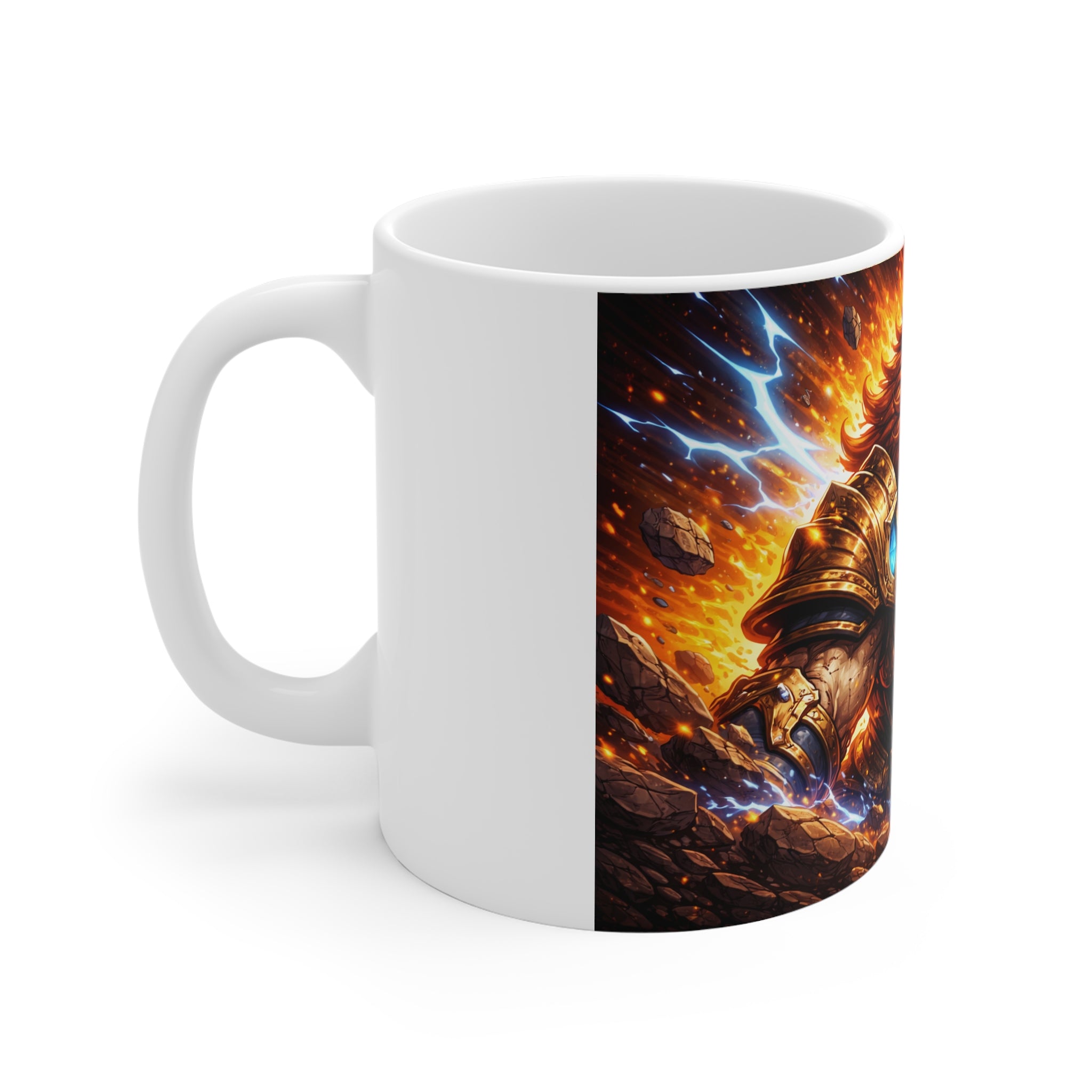Unleash fearless energy with every sip. This 11oz ceramic mug features a powerful armored lion bursting through fire and lightning—symbolizing strength, courage, and relentless determination.
